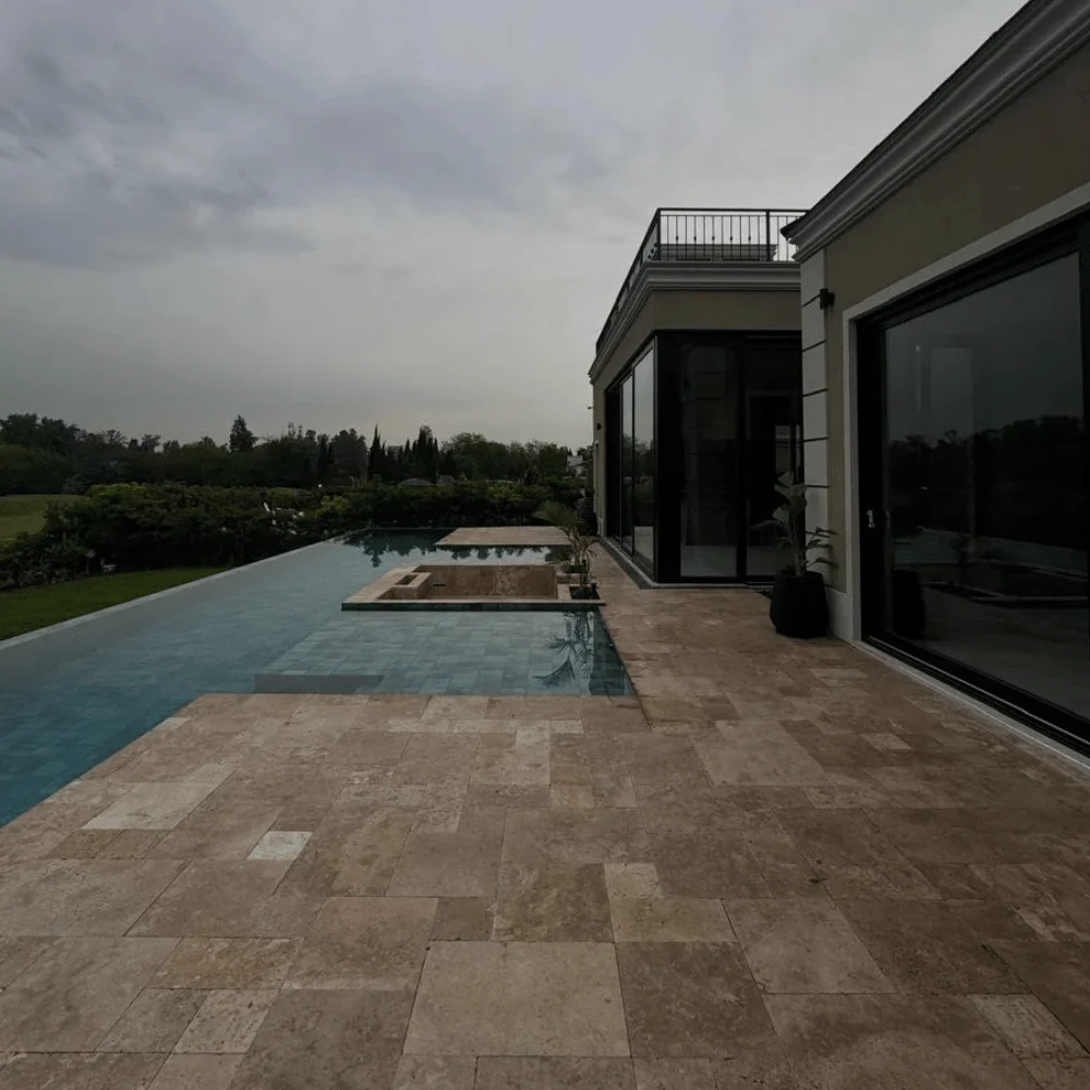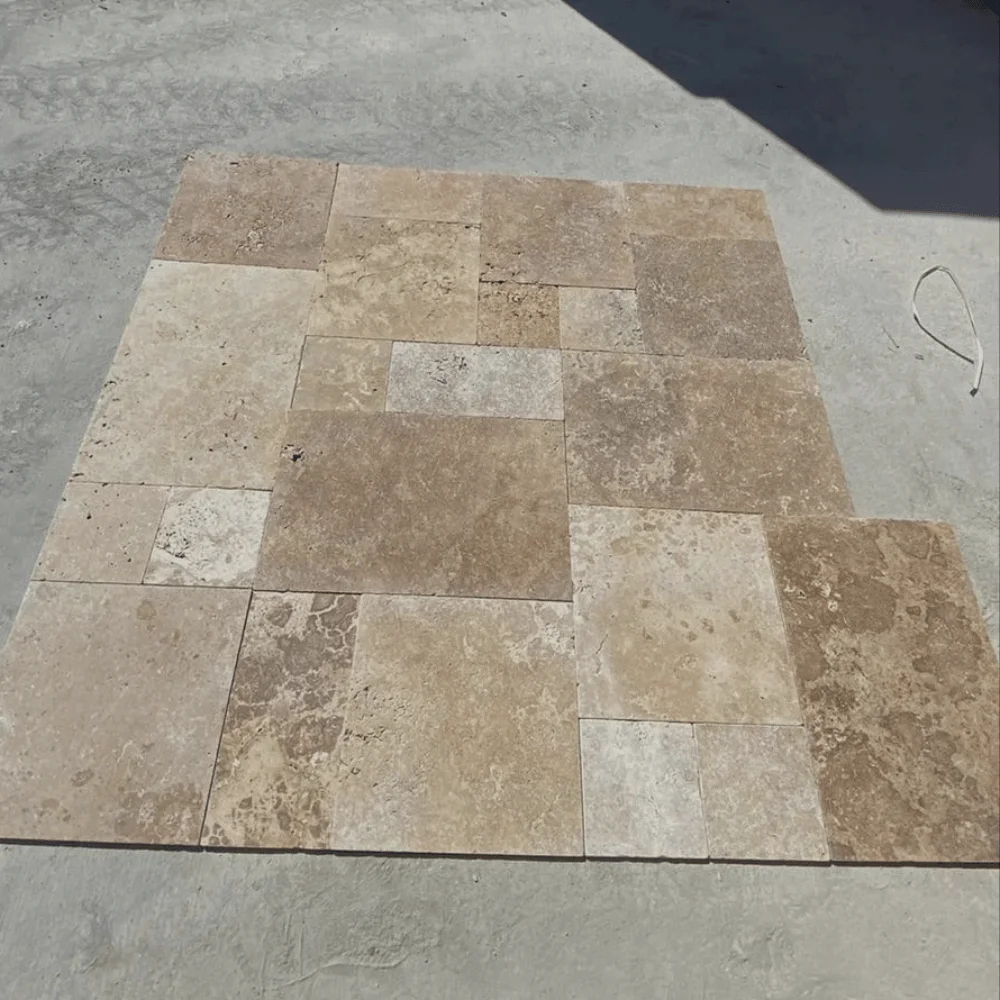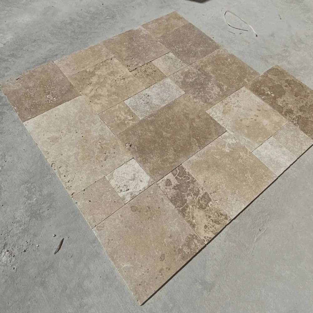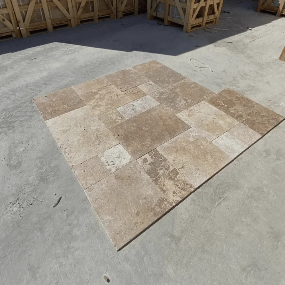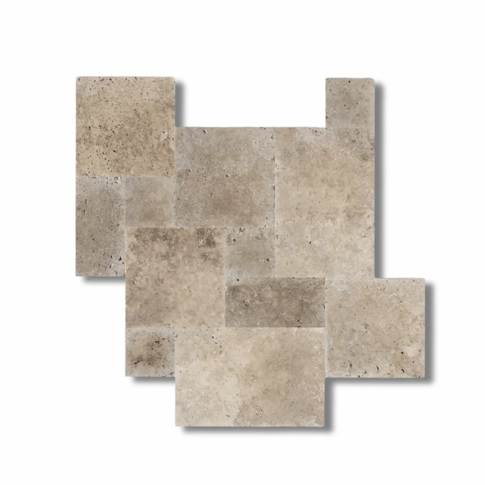 Trawertyn Noce French Pattern to komplet rzymski (opus romano) składający się z płytek w czterech formatach, zaprojektowany tak, by tworzyć harmonijną i elegancką powierzchnię. Naturalna, ciepła, beżowa tonacja trawertynu Noce nadaje wnętrzom i przestrzeniom zewnętrznym przytulny, ponadczasowy charakter. Wykończenie naturalne z delikatną strukturą kamienia podkreśla autentyczność materiału i sprawia, że każda kompozycja jest unikatowa.